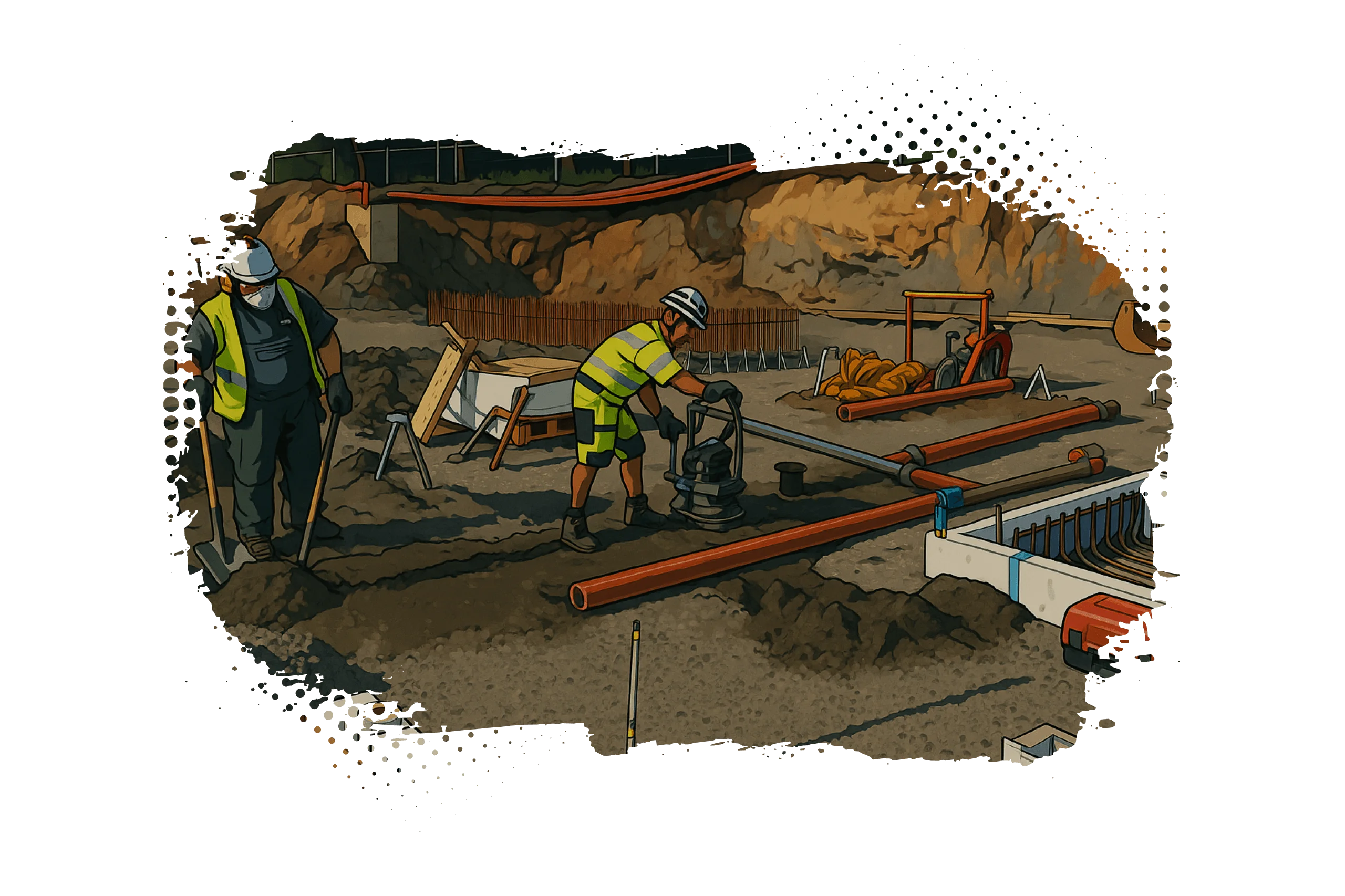 Vi utför alla typer av markarbete: grovschakt, sprängning, tomtplanering, jordsanering, dränering och finplanering med besiktade entreprenadsmaskiner.